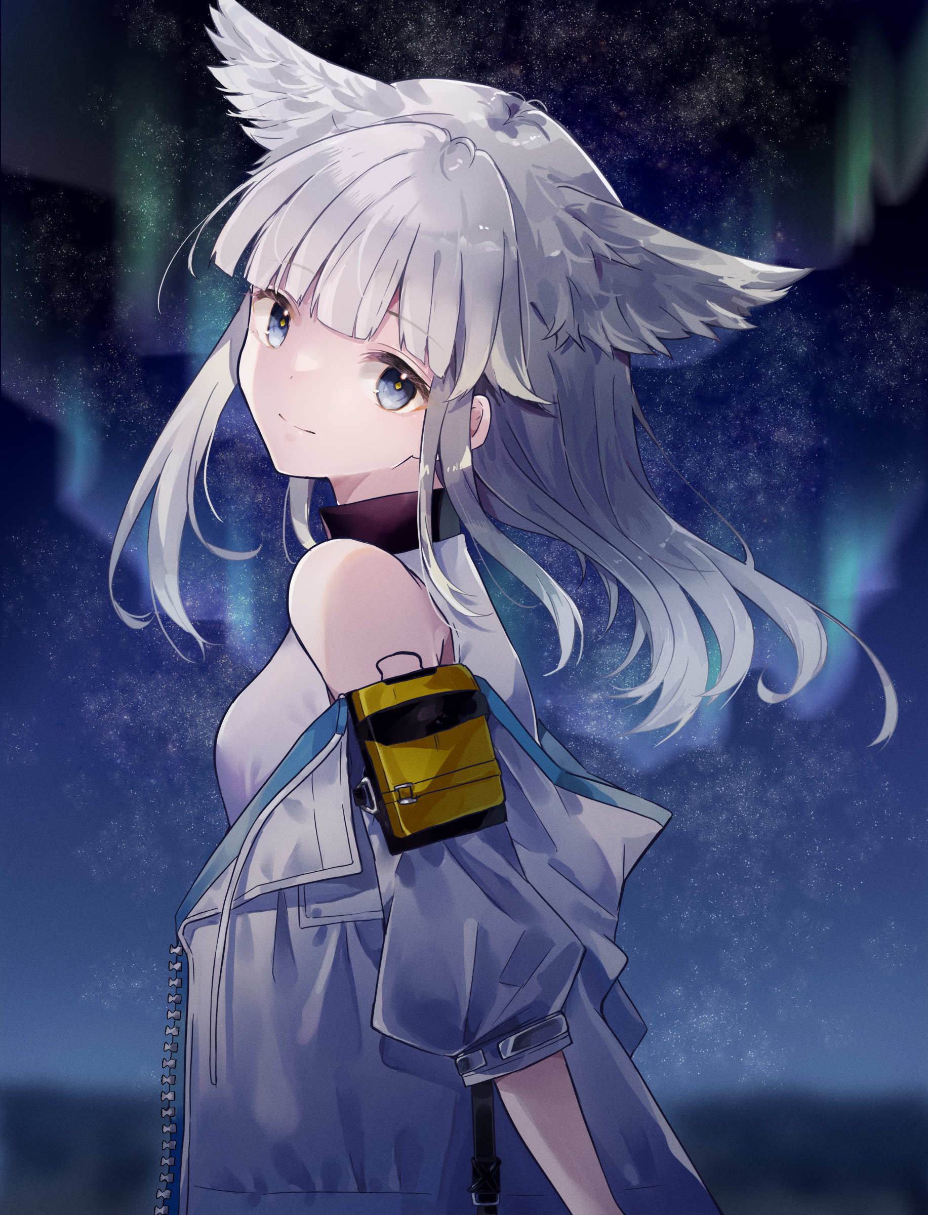 1girlanimal earsaqua eyesarm poucharms at sidesaurorabare shouldersbird earsblunt bangsbreastscollared dresscolored eyelashesdiamond (shape)diamond-shaped pupilsdressfeather hairfilm grainfrom sidehead tiltjacketlight smilelong hairlong sidelockslooking at viewernightnight skyoff shouldersidelocksskysleevelesssleeveless dresssmall breastssolostar (sky)starry skysymbol-shaped pupilsthree-quarter sleevesupper bodywhite dresswhite hairwhite jacketyellow pupilszipper