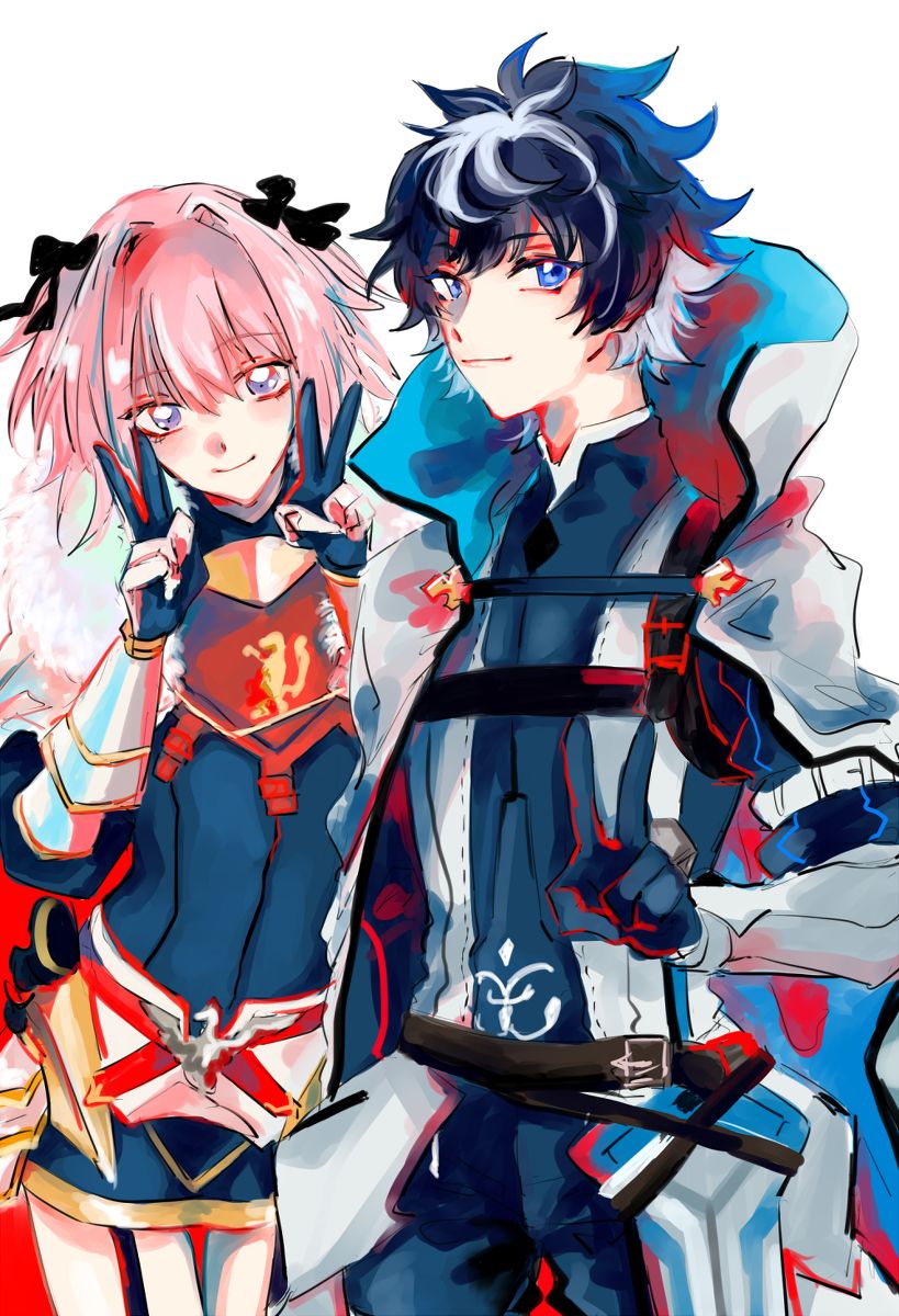 2boysandrogynousblack hairblue eyesbowcapeclosed mouthcowboy shotdouble vfur trimfur-trimmed capegorgethair bowhair intakeshorn (instrument)male focusmulticolored hairmultiple boyspink hairpurple eyesshort hairsimple backgroundsmilestreaked hairvwhite background