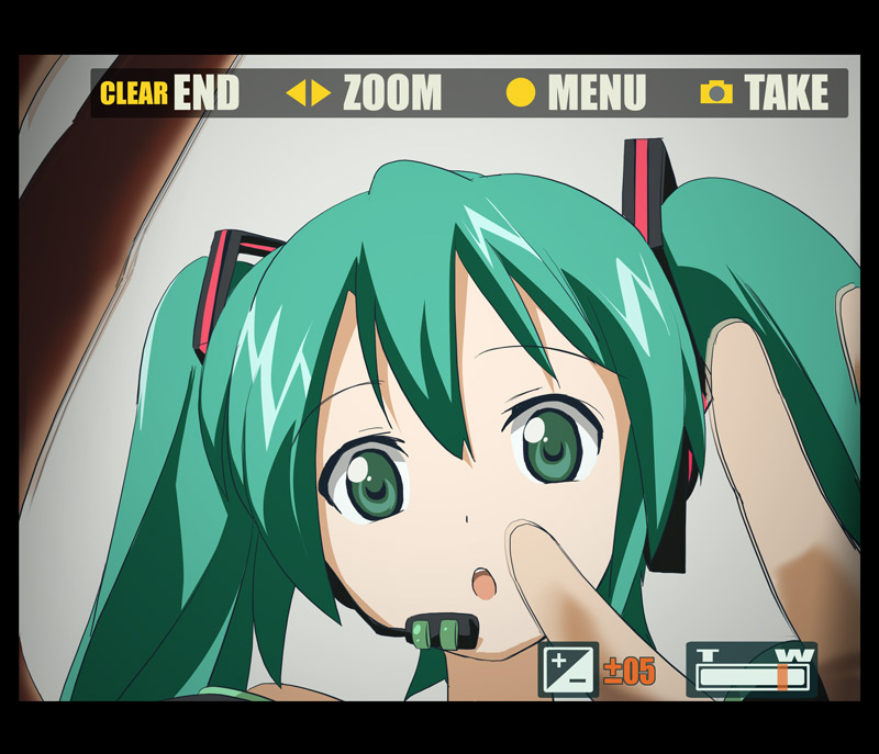 :o00s1girlcamerafemale focusgreen eyesgreen hairlong hairlooking at viewermatching hair/eyesopen mouthsolotwintailsviewfinder