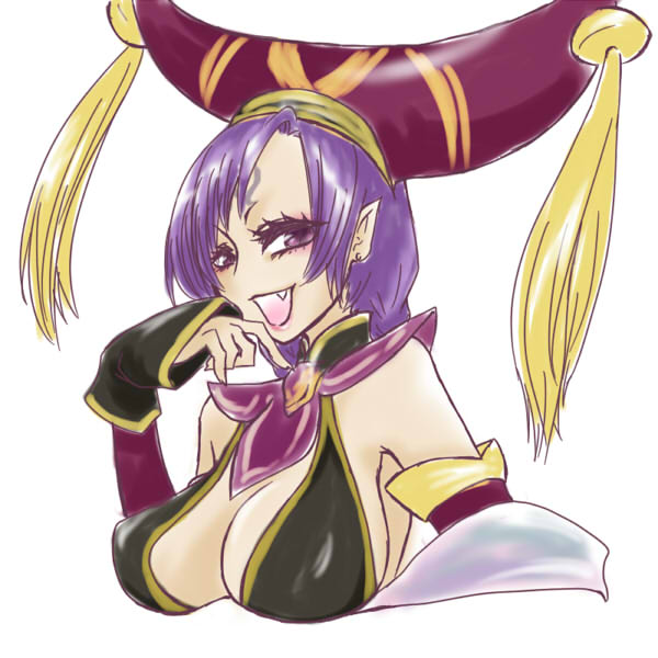 :d1girlarm warmersarmpitsbare shouldersbreastscleavagecollarcrop topfemale focuslarge breastslooking at vieweropen mouthpointy earspurple eyespurple hairsmilesolotassel