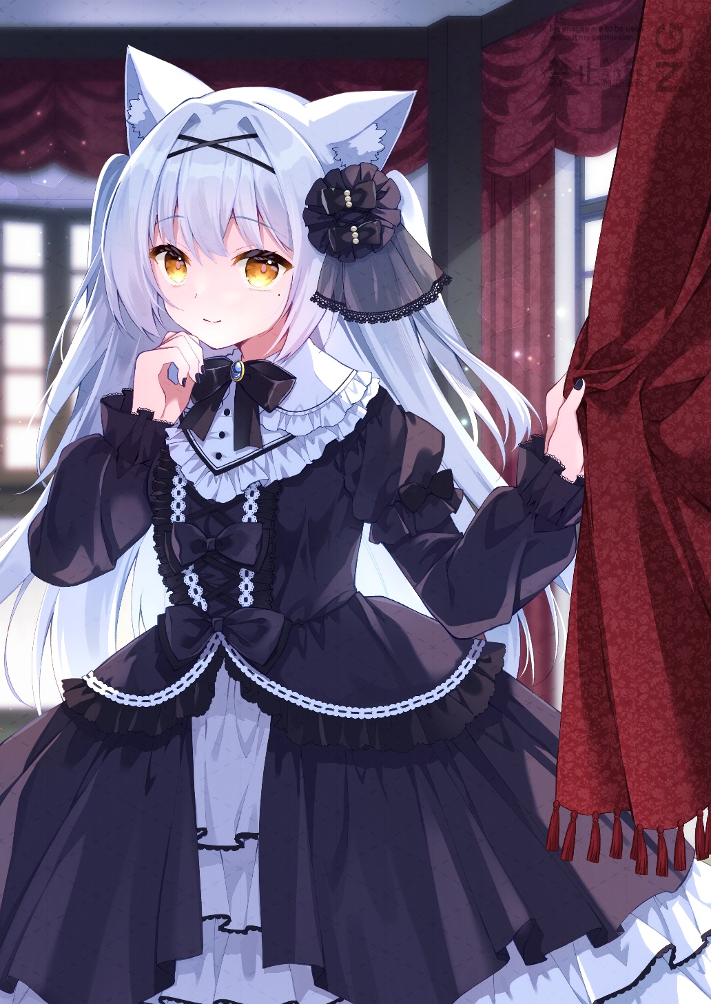riku (artist), riku (wana), remilia scarlet, touhou, silver hair, bad id, bad pixiv id, 1girl, bare shoulders, bat wings, cup, dress, female focus, flat chest, hair ribbon, red eyes, ribbon, short hair, skirt, solo, teacup, thighhighs, wings