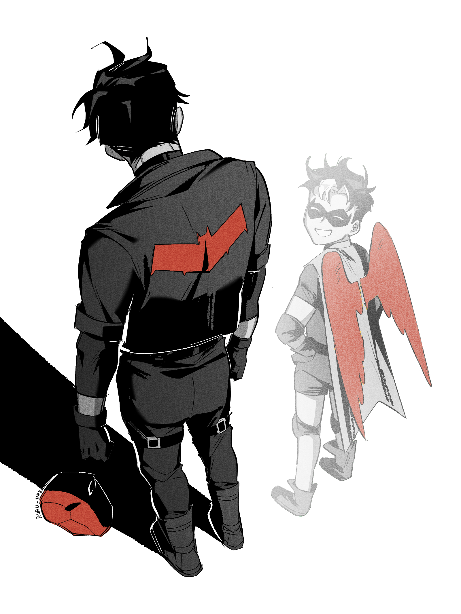 2boysbat signalbatman symbolblack glovesblack hairblack shirtdual personaglovesjacketmale focusmaskmulticolored hairmultiple boysmuscularmuscular maleopen clothespantsred hood and the outlawsred maskshirtshort hairsimple backgroundsmilesuperhero costumetaut bodysuittwo-tone bodysuitwhite background