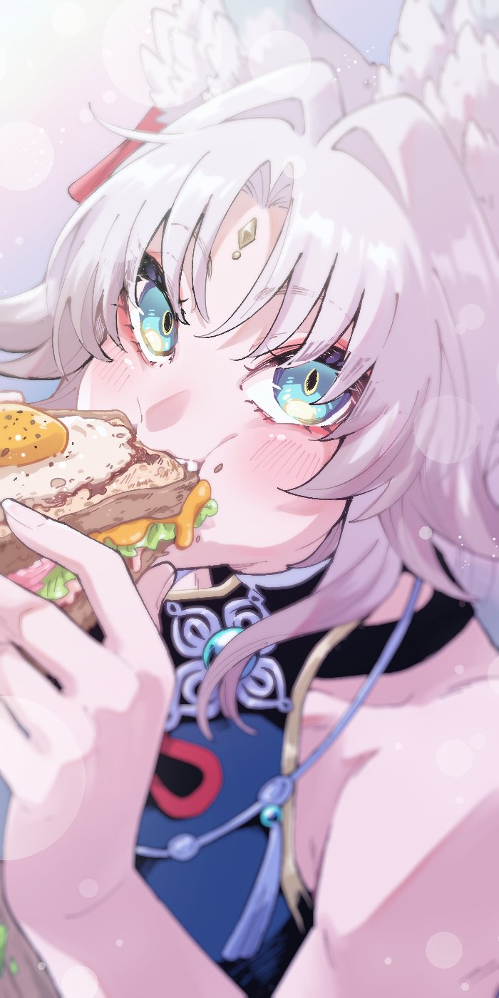 1girlanimal ear fluffanimal earsblue eyeseatingeyelinerfoodfood on faceforehead jewelfox earsfox girlhigh ponytailmakeupmulticolored eyesno coatparted bangsponytailred eyelinersolo