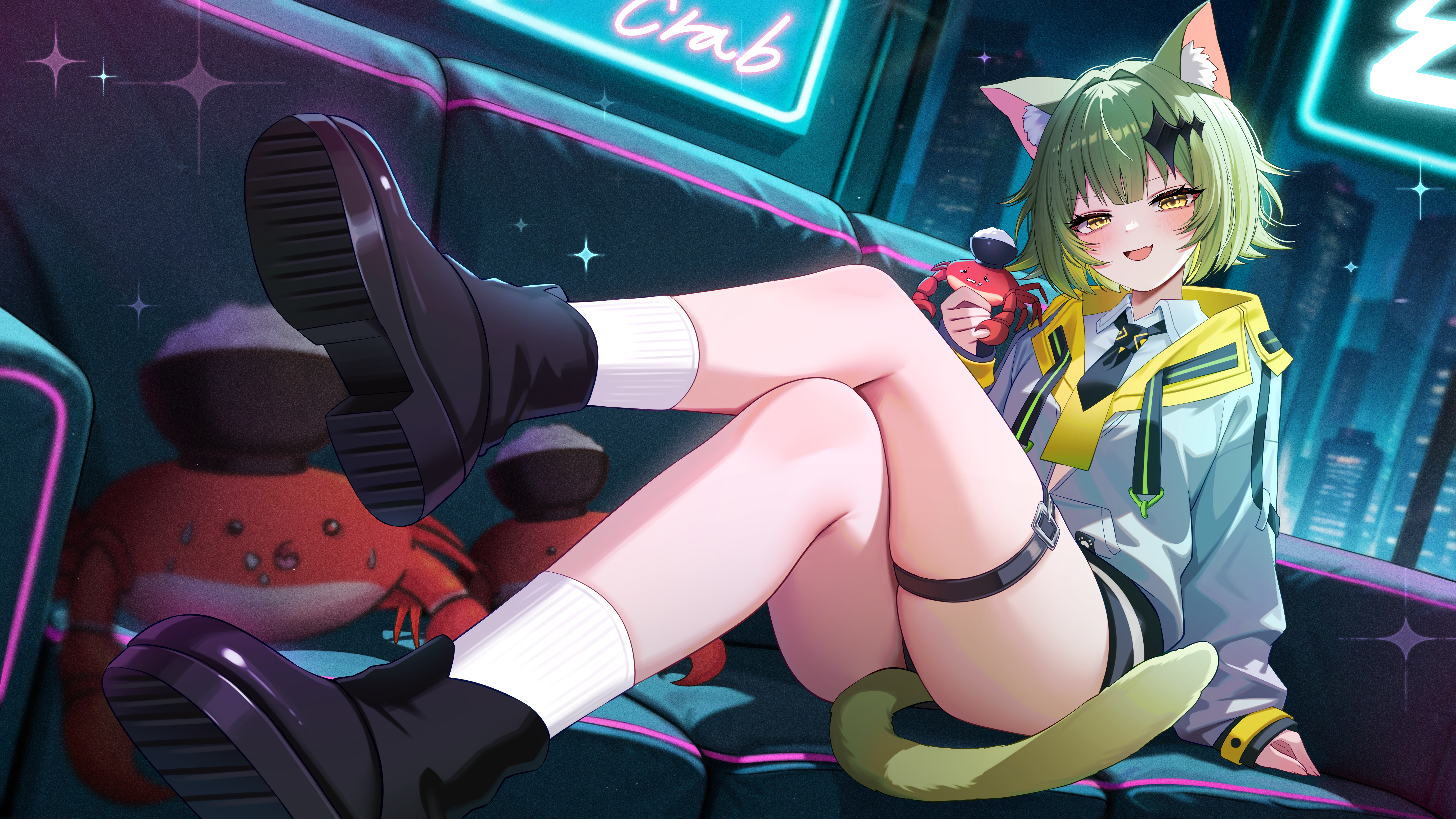 :d1girlanimalanimal ear fluffanimal earsarm at sidebacklightingblack necktieblack shoesblunt bangsblurryblurry backgroundblushcat earscat girlcat tailcollared shirtcouchcrabcrossed legsdutch angleenglish texteyelasheseyes visible through hairfangflipped hairforeshorteningfull bodygreen hairgreen tailhair intakeshand upholdingholding animalindoorsjacketlegslooking at viewernecktienighton couchopen mouthshirtshoe solesshoesshort hairshort necktiesittingskin fangskindentationsleeves past wristssmilesmugsockssolosparklesparkle hair ornamenttailthigh strapthighstsurimev-shaped eyebrowsvirtual youtuberwhite jacketwhite shirtwhite sockswindowyellow eyes