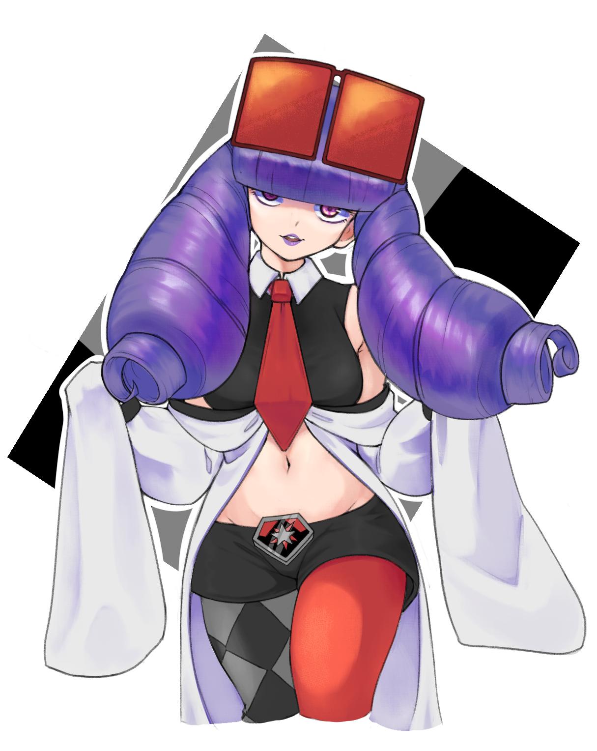 1girlasymmetrical legweardrill hairlooking at viewermidriffmismatched legwearmoonie (mbeams3)navelnecktiepantyhoseparted lipspurple hairpurple lipsred eyesred necktiered-tinted eyewearsleeves past fingerssleeves past wristssolotinted eyeweartwin drills