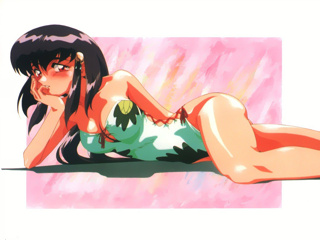 1990s (style)1girlblushbreastsfemale focushead restlong hairlyingon sideone-piece swimsuitpink backgroundpurple hairred eyesretro artstylesoloswimsuit