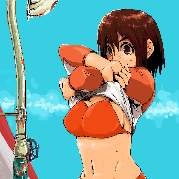 1girlbikinibreastsbrown eyesbrown haircleavageclothes liftdayfemale focuslarge breastsoekakiorange bikinishirt liftshort hairshoweringskysoloswimsuitteacherthick eyebrowsundressing