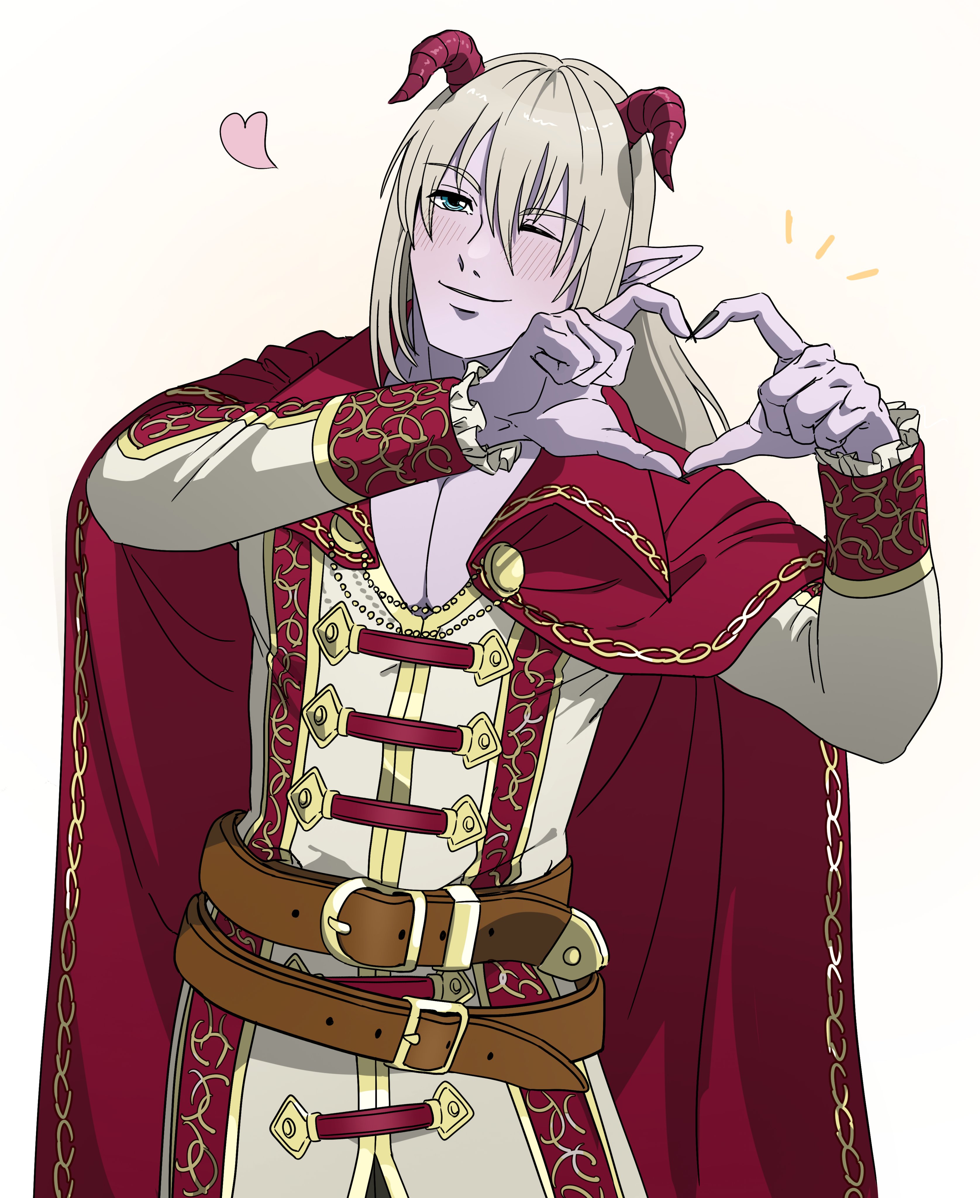 1boybeltblack nailsblonde hairblue eyesbrown beltcapecolored skindemon boyfingernailsheartheart handshornslong hairlooking at viewermale focusmultiple beltsnanamono 0414one eye closedpectoral cleavagepectoralspointy earspurple skinred capered hornssharp fingernailsshirtsmilesoloupper bodywhite backgroundwhite shirt