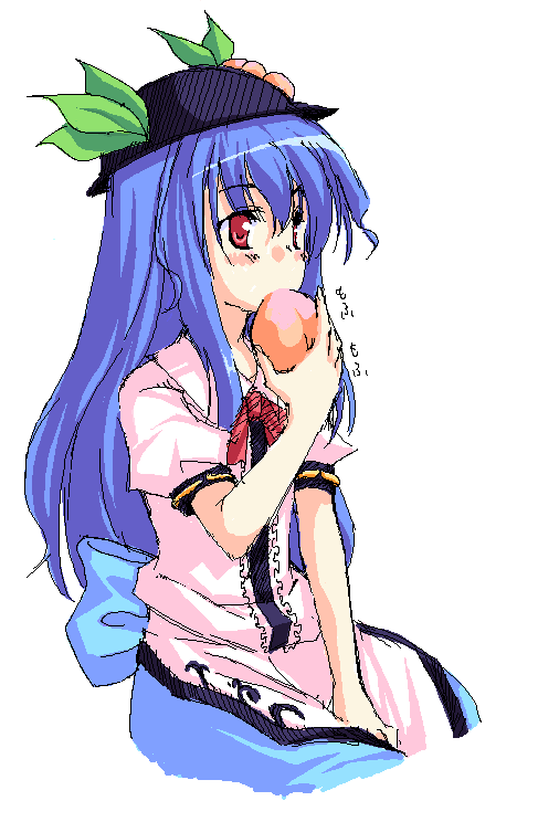 1girlblue haireatingfemale focusfoodfruithatholdingholding foodholding fruitleafoekakipeachred eyessolo