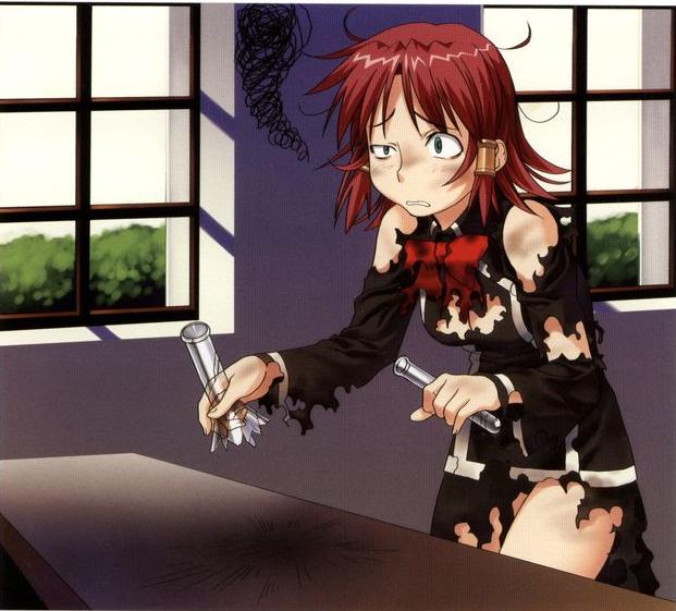 1girlbare shouldersexplosionfailurefemale focusflaskgreen eyesmessy hairred hairshort hairsmokesolotest tubetorn clothes