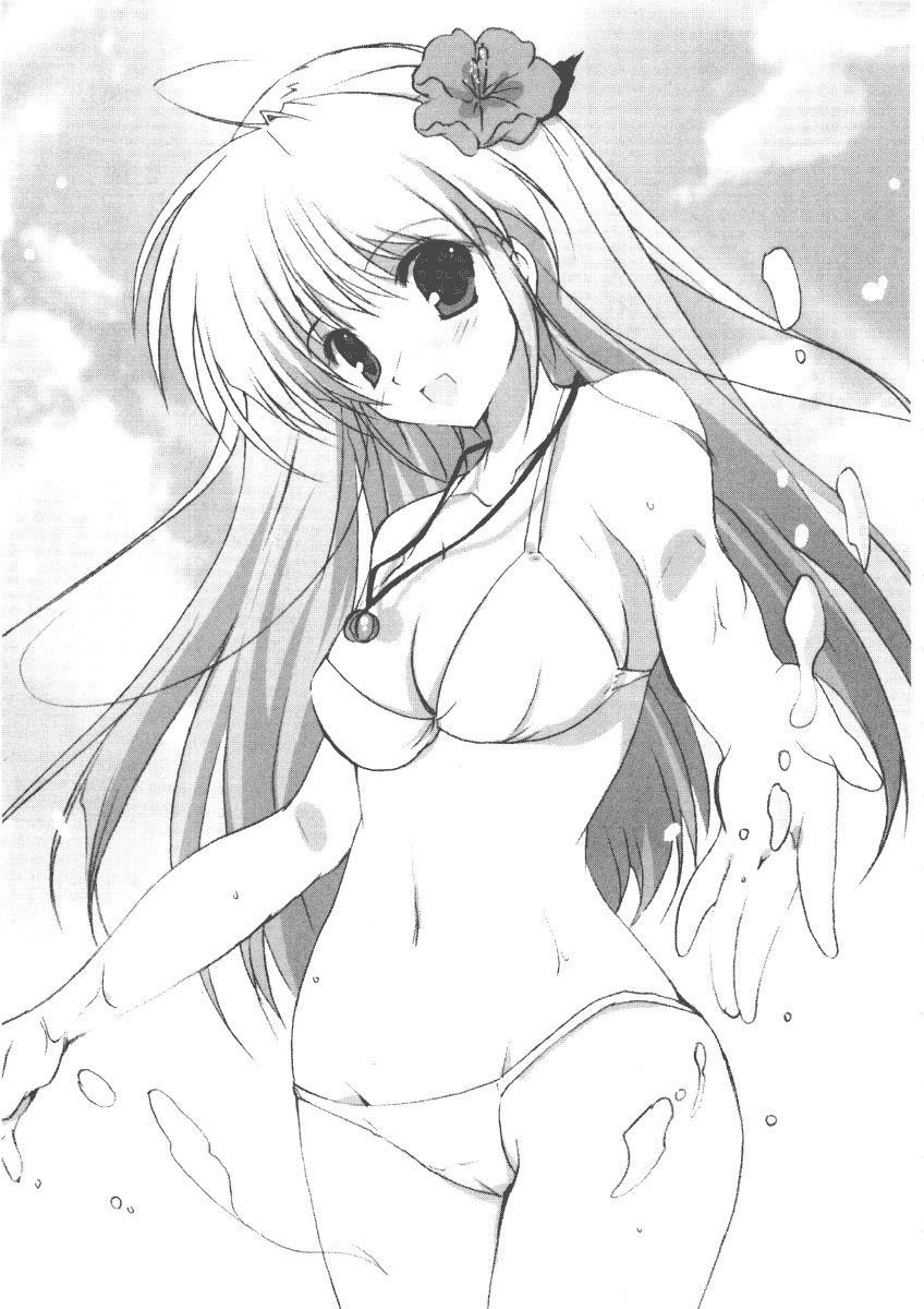 1girlbikinicowboy shotfemale focusflowergreyscalehair flowerhair ornamenthibiscusjewelrylong hairmonochromenecklaceskysoloswimsuit