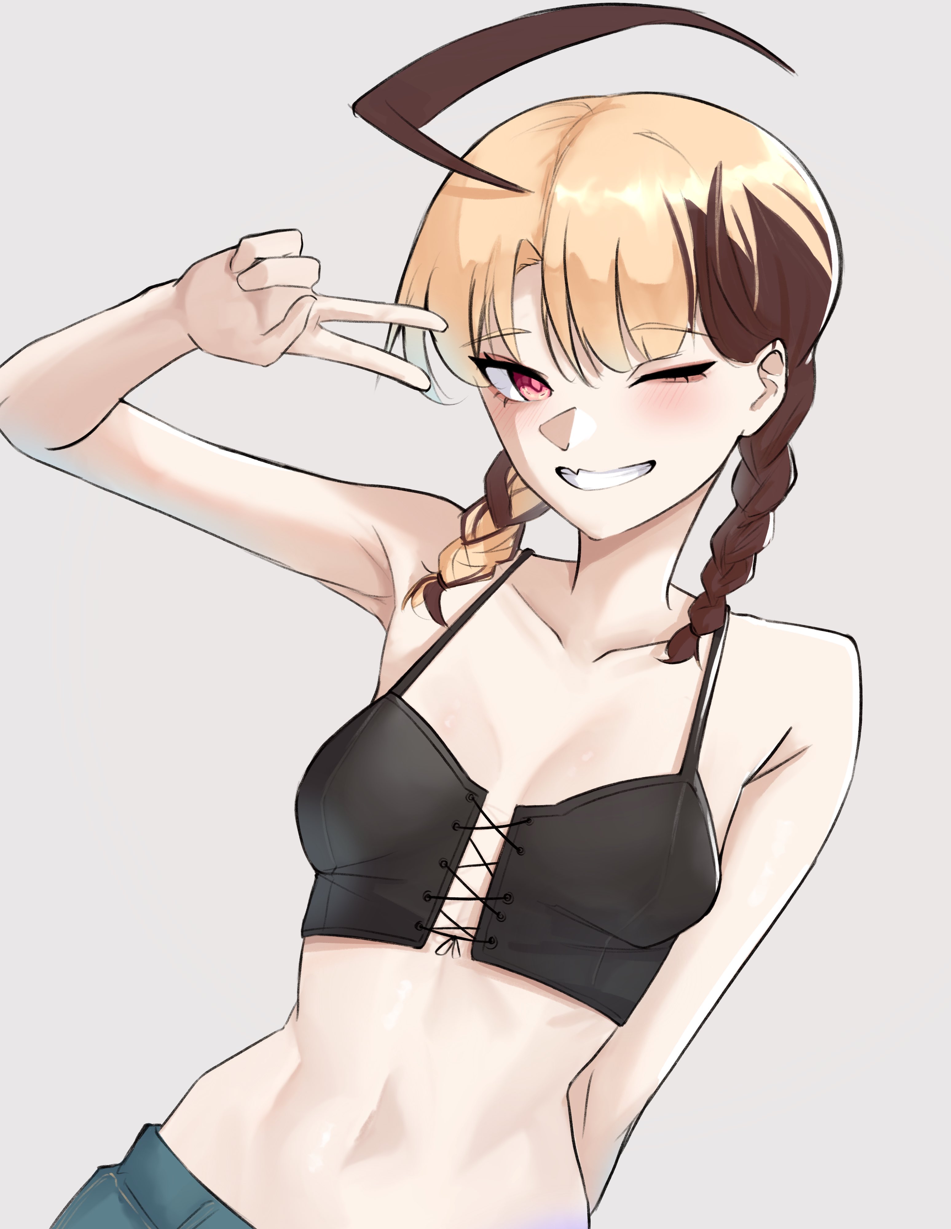 hase yu, kousaka tamaki, to heart (series), to heart 2, 00s, 1girl, :p, alcohol, blush, breast lift, breasts, brown eyes, bust cup, cherry blossoms, female focus, large breasts, long hair, navel, nipples, nude, one eye closed, petals, red hair, sake, solo, tongue, tongue out, wink