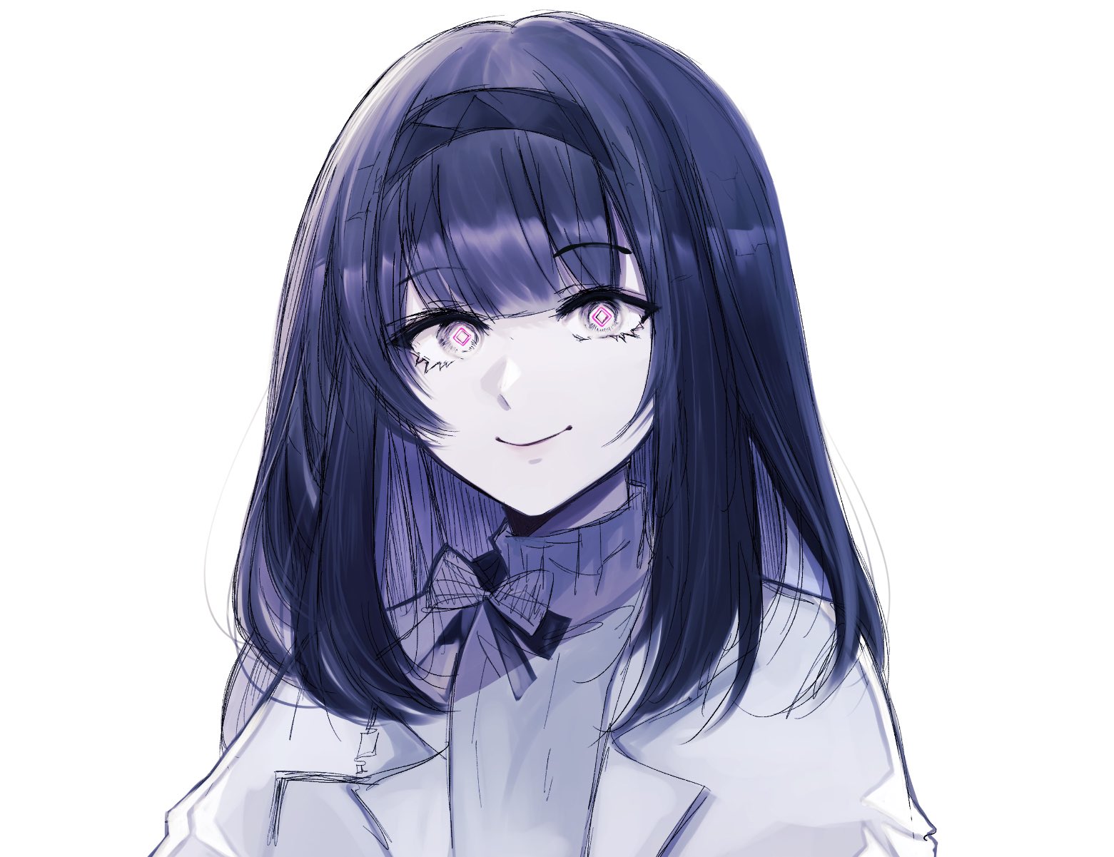 1girlblack hairblack hairbandclosed mouthdiamond (shape)diamond-shaped pupilsgrey eyeshairbandjacketlapelslooking at viewermedium hairportraitsimple backgroundsmilesolosweatersymbol-shaped pupilsturtleneckturtleneck sweaterwhite backgroundwhite jacketwhite sweater
