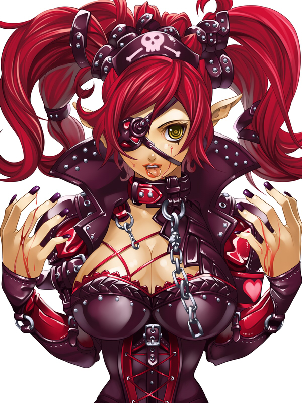 1girlbloodbreastschaincleavagecollareyepatchfemale focushatlarge breastslong hairpointy earsred hairsolotongueyellow eyes