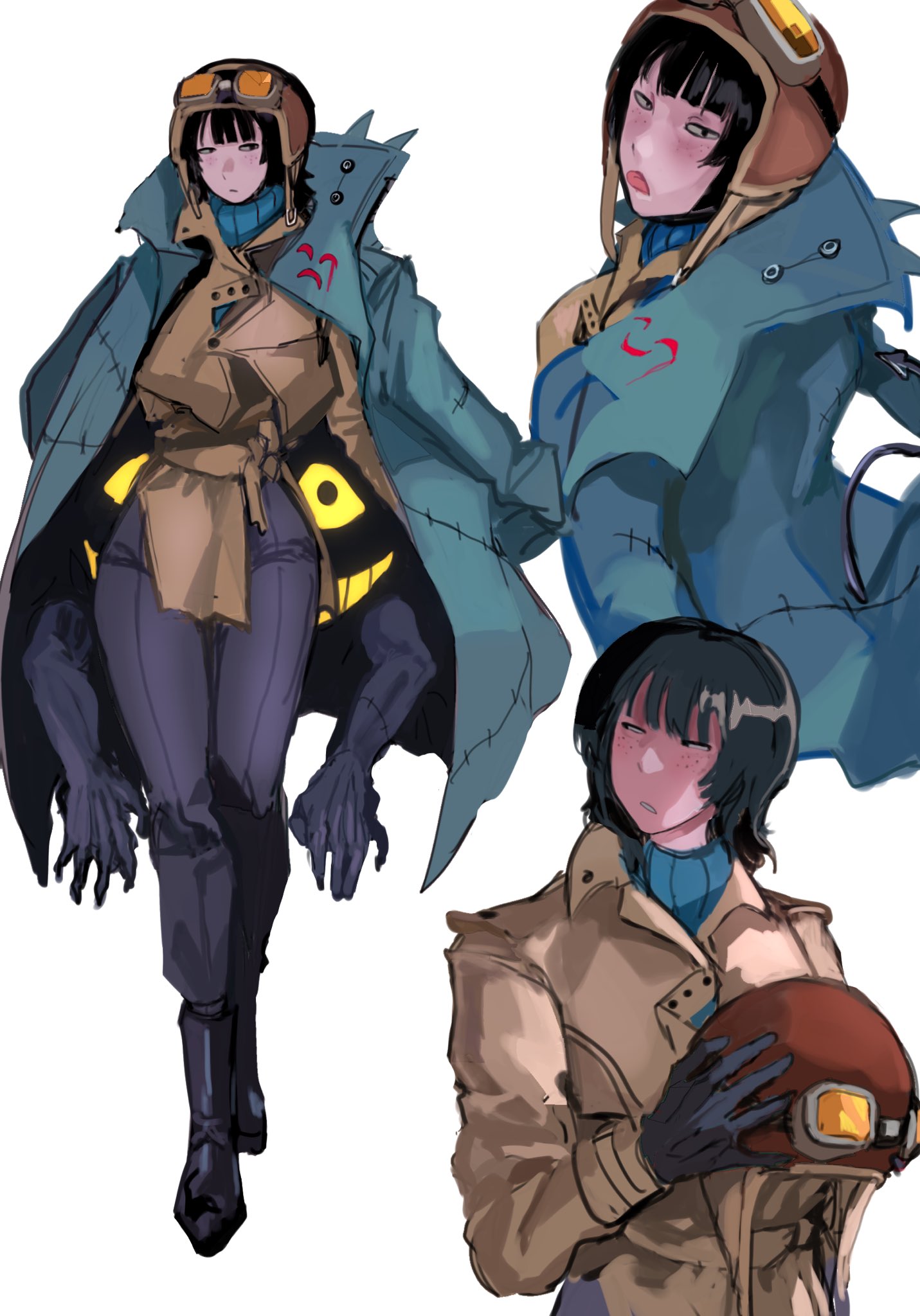 1girl1otheraviator capaviator gogglesblack bootsblack hairblack pantsbootsbuttonscoatdress pantsfrecklesgloveshatholdingholding unworn clothesholding unworn hatliving clotheslong sleeveslooking backmultiple viewsopen mouthpantsshort hairsimple backgroundsweatertonguetongue outtrench coatturtleneckturtleneck sweaterunworn hatunworn headwearwhite background