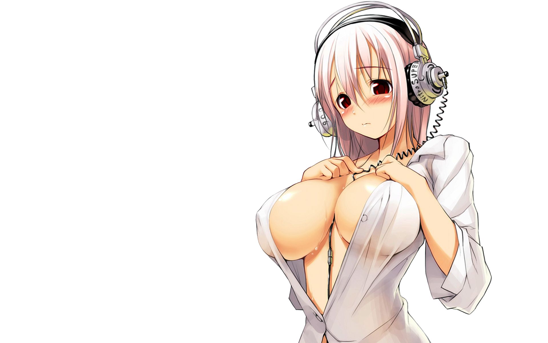 1girlbreastsfemale focusheadphoneshuge breastsnitro superopen clothesopen shirtpink hairshirtsimple backgroundsolo