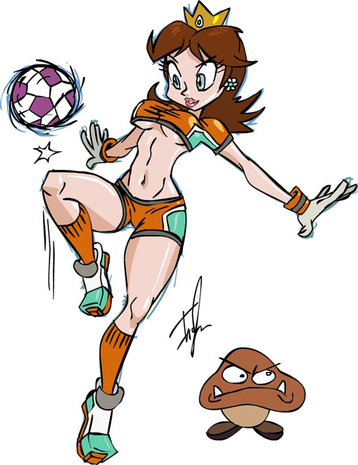 1girlalternate costumeblue eyesbreastsbrown haircrownfemale focuslegsshortssoccersolotomboyunderboob