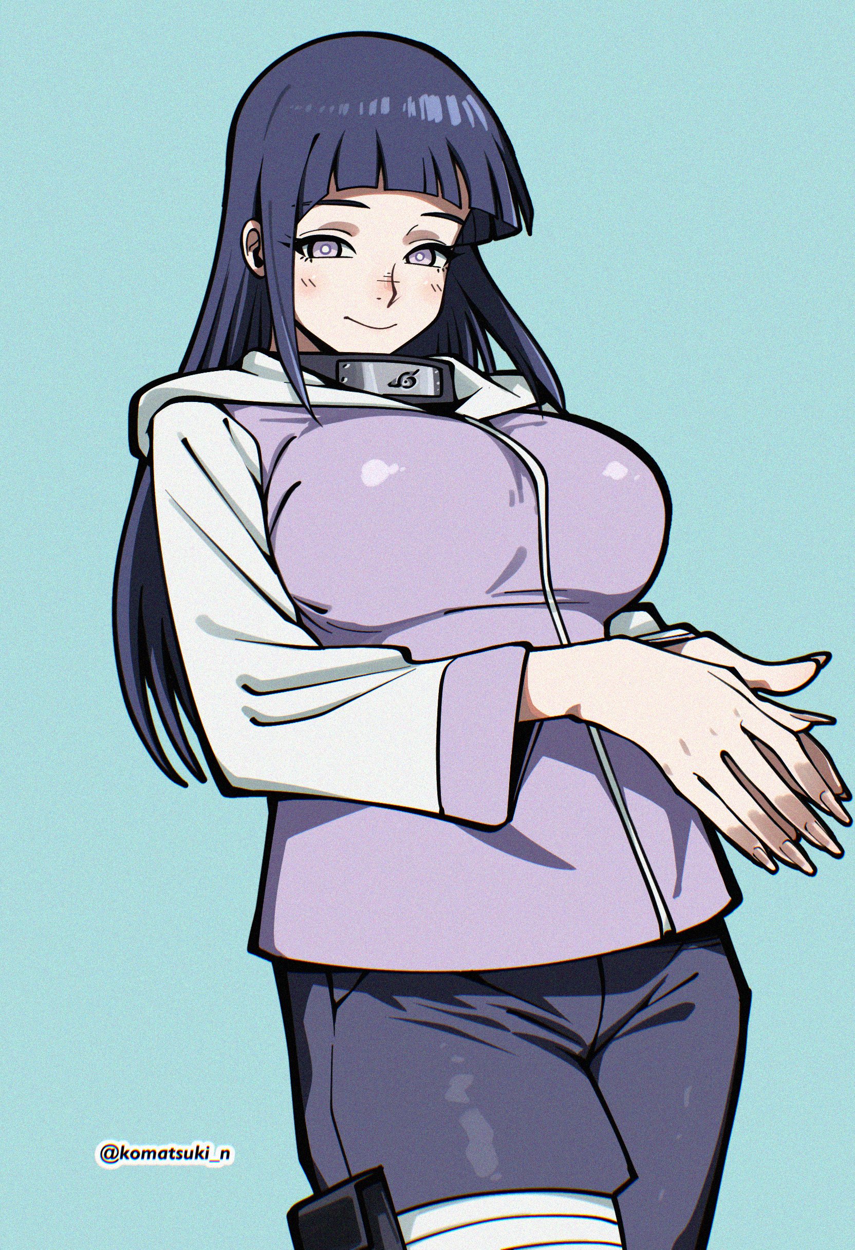 1girlaqua backgroundblunt bangsblushbreastsclosed mouthfingernailsforehead protectorhoodhood downhoodiekonohagakure symbollarge breastslong hairlong sleevesown hands togetherpurple eyessimple backgroundsmilesolostraight hairtwitter username