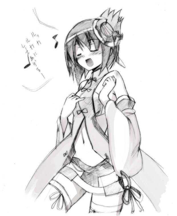 :d00s1girlbare shouldersblushcenter openingclosed eyesfemale focusfolded ponytailgreyscalemonochromemusicmusical notenavelopen mouthquavershort hairsimple backgroundsingingskirtsmilesolostandingthighhighswhite backgroundzettai ryouiki