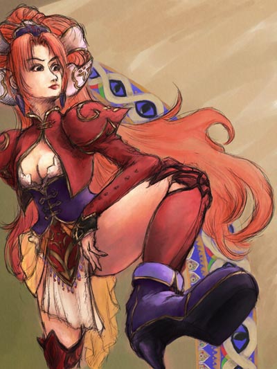 sumeragi seisuke, gwendolyn (odin sphere), velvet (odin sphere), odin sphere, 2girls, armor, armored dress, breasts, dress, long hair, midriff, multiple girls, short hair, siblings, sisters, thighhighs