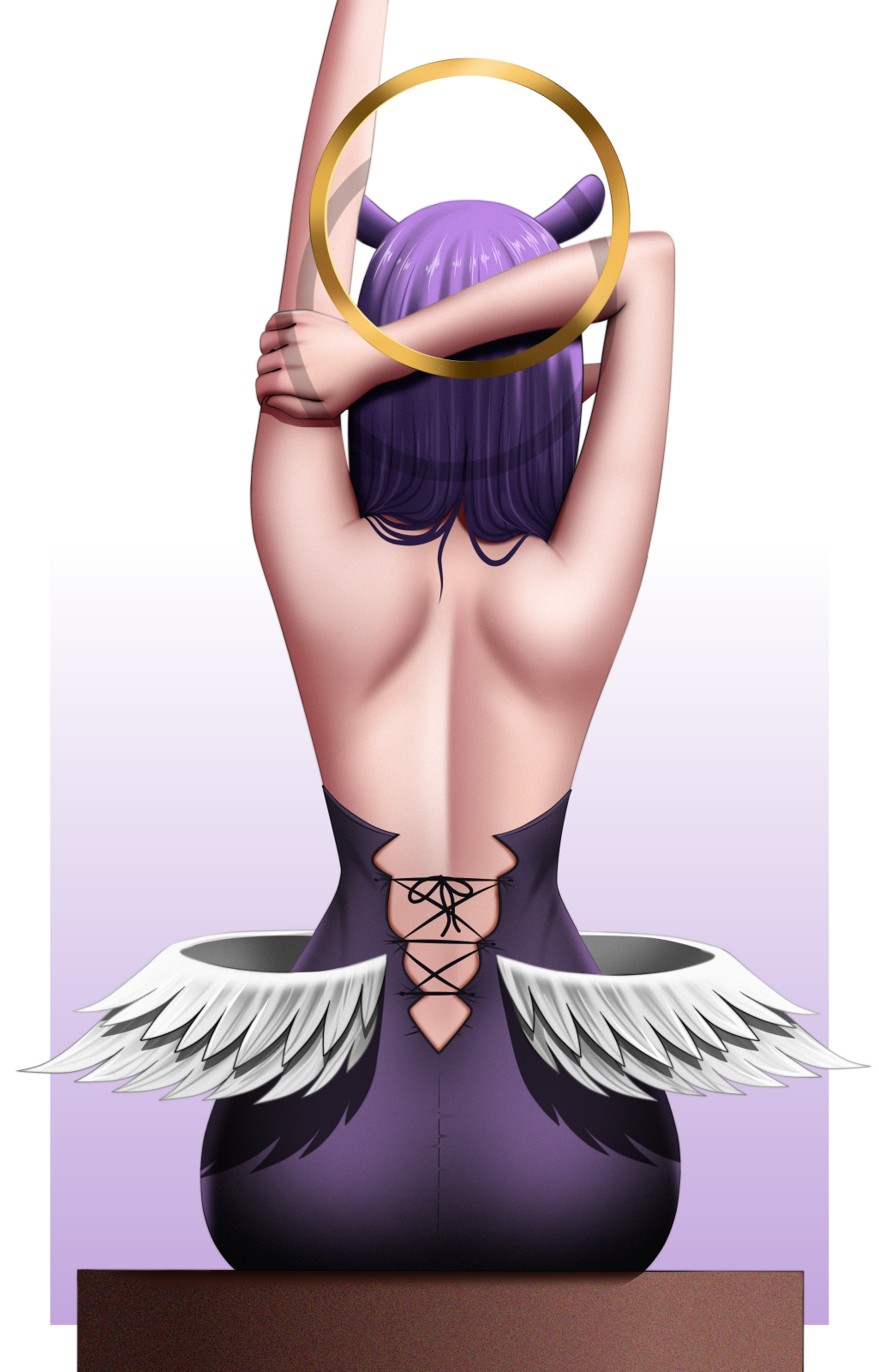 1girlarms upbackdressfrom behindhaloina's back (meme)long hairmemepurple dresspurple hairsolotentacle hairvirtual youtuberyellow halo