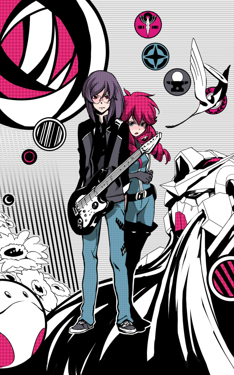 00s1boy1girlbootsflowerglassesguitarinstrumentpink hairpurple hairsorabustandingthigh bootsthighhighs