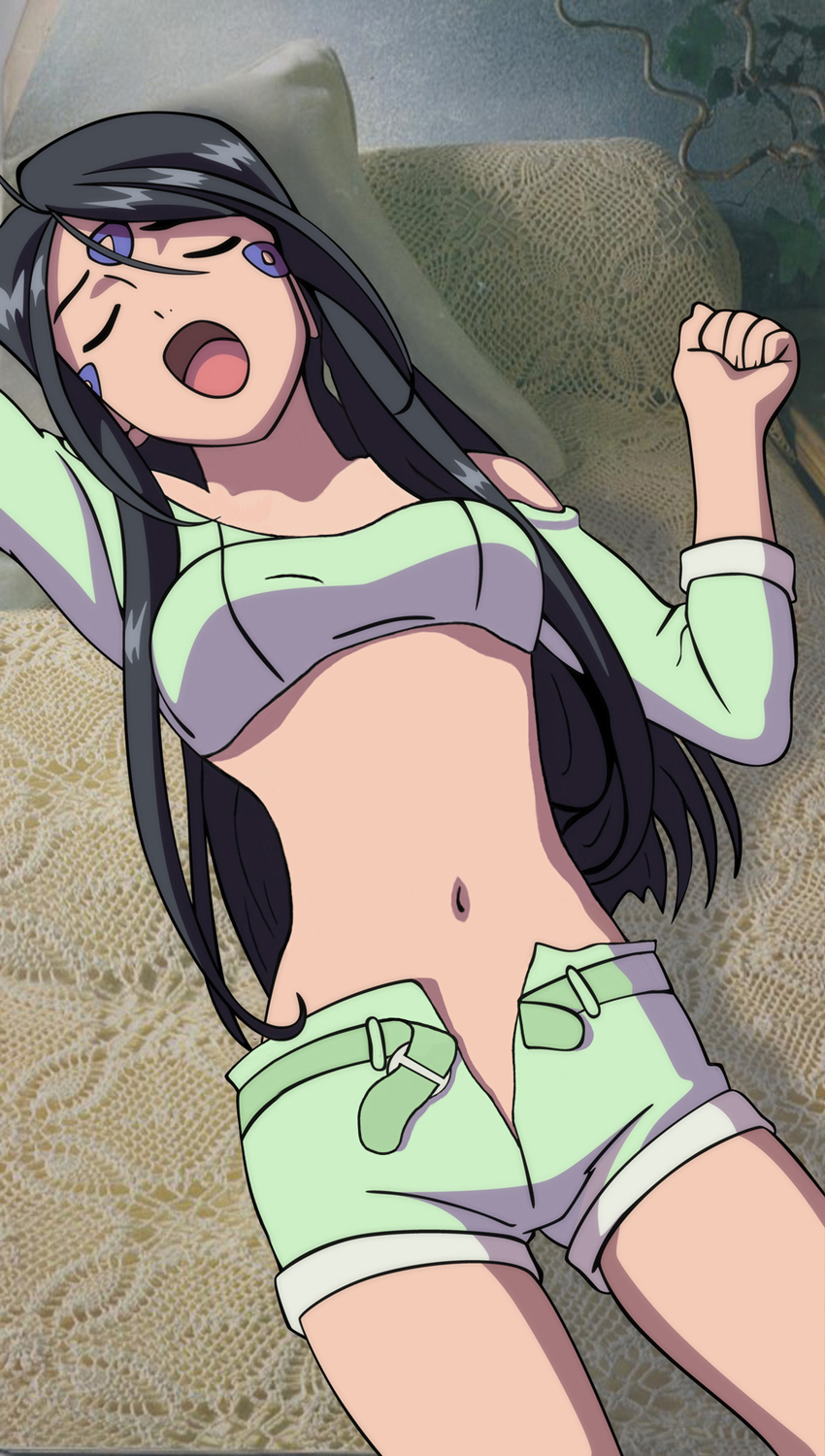 1girlbedbeltblack hairmidriffno pantiesopen beltopen clothesopen flyopen mouthopen shortsshort shortsshortssleepingstretchingunbuckledunbuttonedunzippedyawning