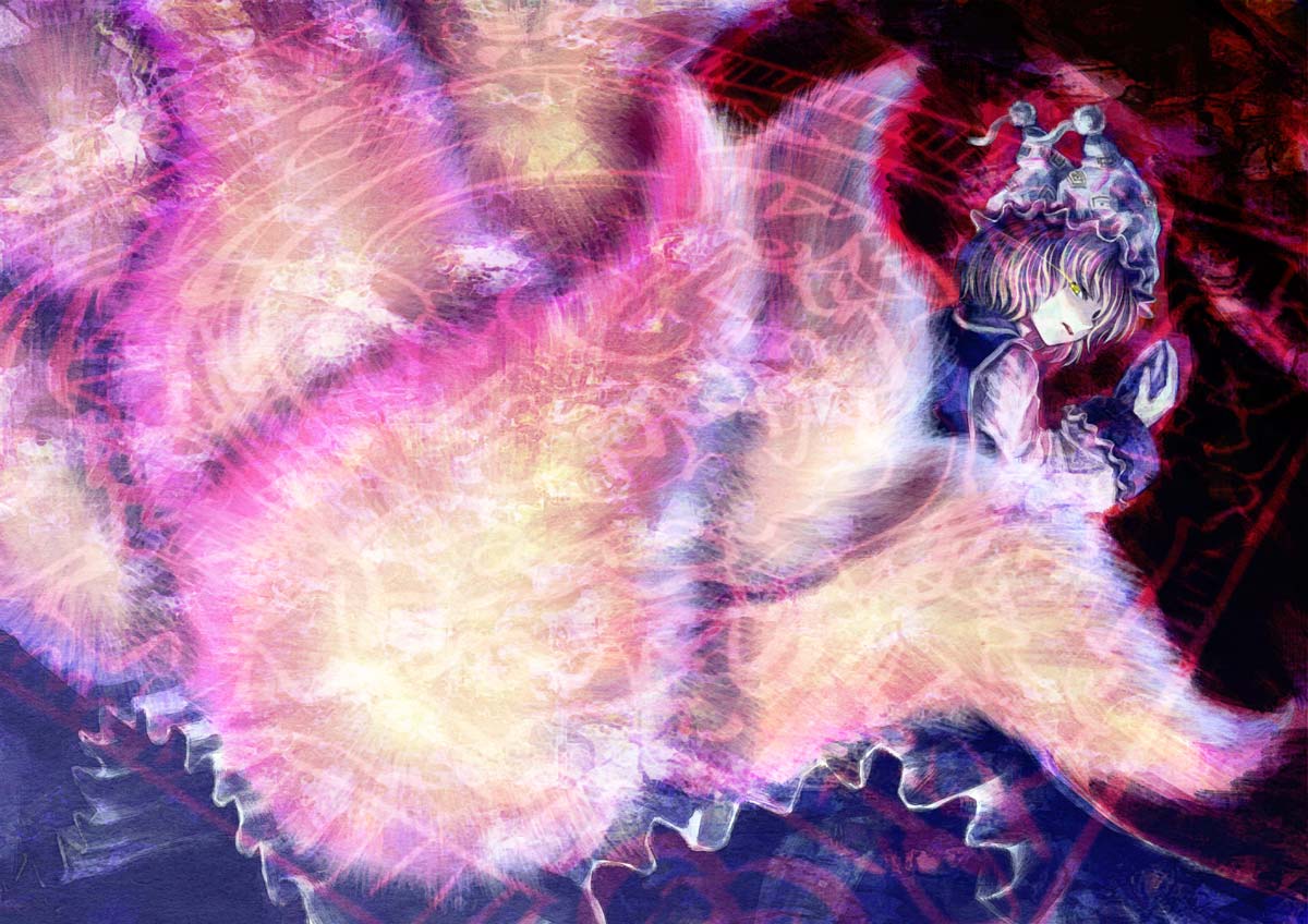 1girlanimal earsanimal hatblonde hairfemale focusfox tailglowinghatlong sleeveslooking backmagic circlemob capmultiple tailsshort hairsolotailtasselwide sleevesyellow eyes