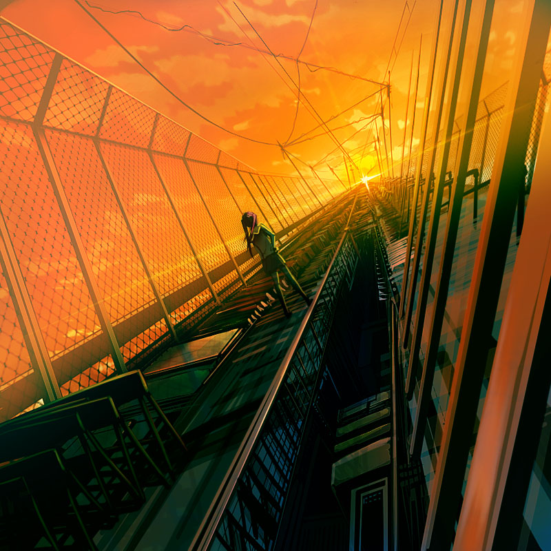 00s1girldiffraction spikesfemale focushand on own hipkneehighsminiskirtorange skyoutdoorssceneryschool uniformserafukuskirtskysockssolostandingsunsetyellow sky