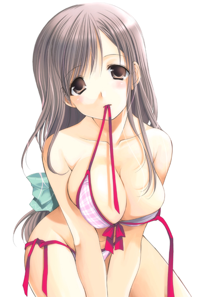 1girlbikinibikini in mouthbreastsbrown eyesbrown haircleavageclothes in mouthfemale focuslarge breastslong hairmouth holdpink bikiniplaid bikiniplaid clothesribbonside-tie bikini bottomsoloswimsuituntied bikini