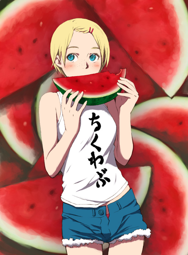 1girlblonde hairblue eyesblushdenimdenim shortsfemale focusfoodfrecklesfruithair ornamenthairclipholdingholding foodholding fruitholding watermelonshort hairshort shortsshortssolowatermelon