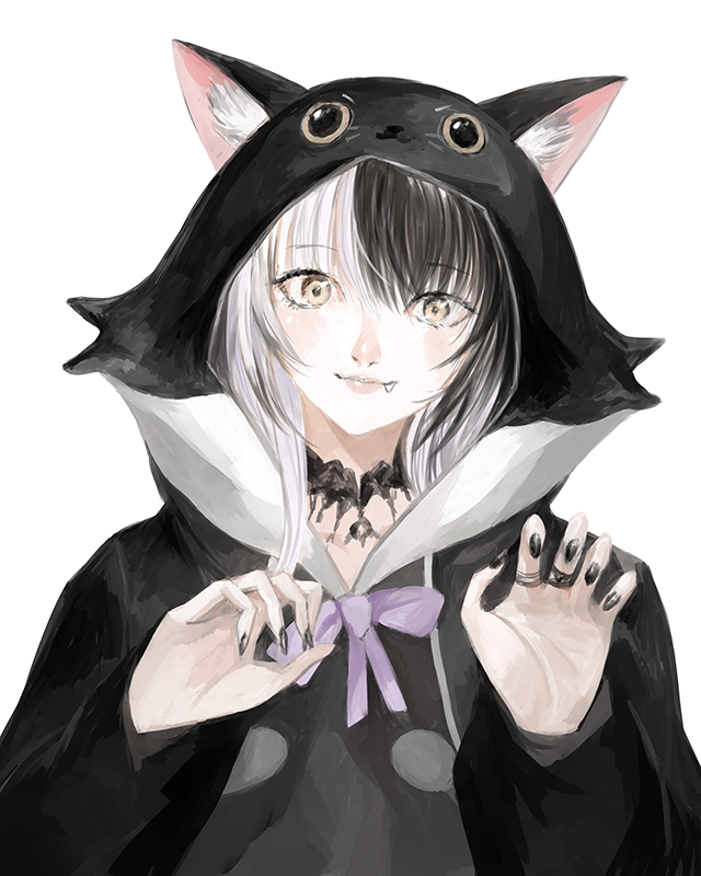 1girlanimal costumeblack chokerblack hairblack nailscat costumechokerclosed mouthfanghands uphoodhood upjewelrylong hairlooking at viewermulticolored hairpolyanthusonlyringsimple backgroundsolosplit-color hairtwo-tone hairvirtual youtuberwhite backgroundwhite hairyellow eyes