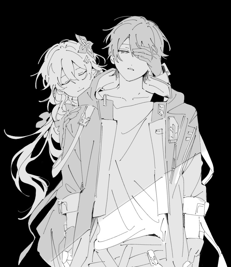 tomihero, original, silver hair, 1boy, 1girl, against glass, bandages, bare shoulders, belt, blunt bangs, choker, couple, eye contact, fantasy, gauntlets, head tilt, hetero, long hair, looking at another, off shoulder, plant, smile, sword, weapon, window