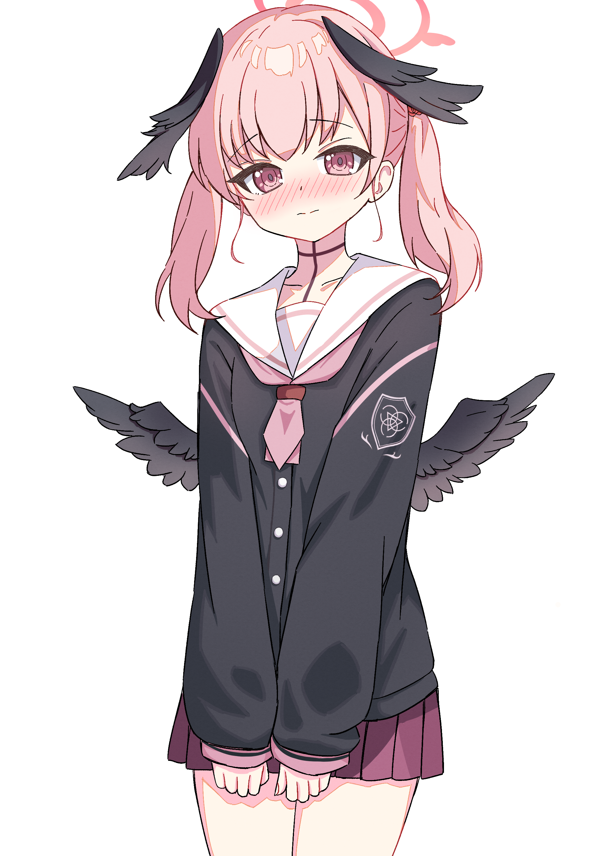 :31girlblack chokerblack shirtblack wingsblushchokerclenched handsclosed mouthcollarbonecowboy shotembarrassedfeathered wingshalolooking at viewerlow wingsmedium hairminiskirtneckerchiefno headwearnose blushpink eyespink hairpink halopink neckerchiefpink skirtpleated skirtsailor collarschool uniformserafukushirtsidelockssimple backgroundskirtsleeves past wristssolosplit mouthtwintailsv armswhite backgroundwhite sailor collarwings