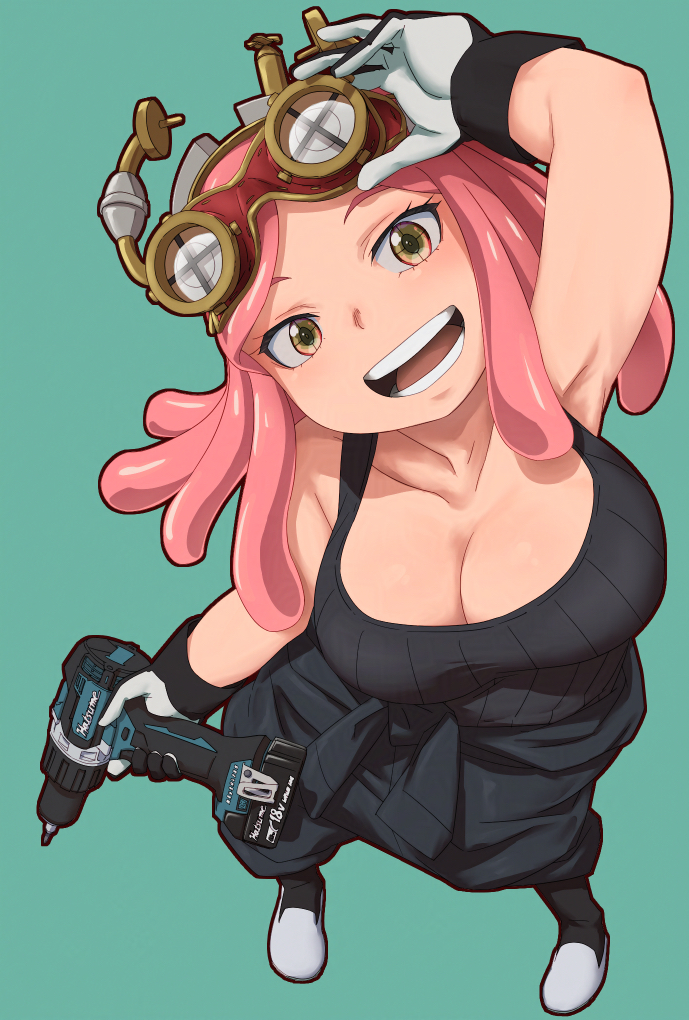1girladjusting gogglesaqua backgroundarmpitsbare shouldersblack glovesblack jacketblack tank topbreastscleavageclothes around waistcollarbonecrosshair pupilsfrom abovefull bodyglovesgogglesgoggles on headholding power drilljacketjacket around waistlarge breastslooking at vieweropen mouthpink hairpower drillribbed tank topshoessimple backgroundsmilesolostandingtank topteethtwo-tone gloveswhite gloveswhite shoesyellow eyes