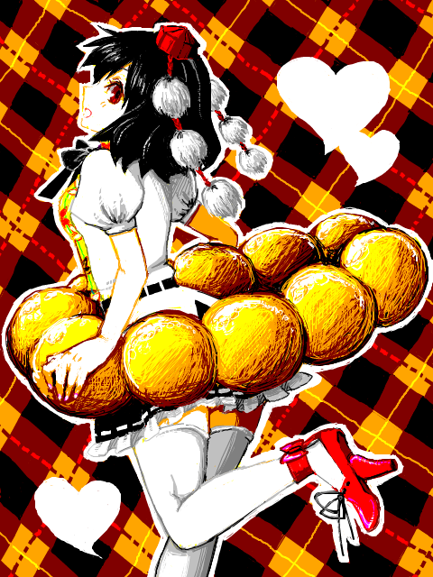 1girlblack hairdonutfemale focusfoodhathearthigh heelslooking at vieweroversized objectshoessolothighhighs