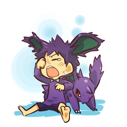 1990s (style)1boyanimal earsbarefootclosed eyescostumecreature and personificationfangfull bodygen 1 pokemonhornsinjurymale focuspersonificationpokemon (creature)purple hairretro artstylescarscratchesshort hairsimple backgroundsittingtears