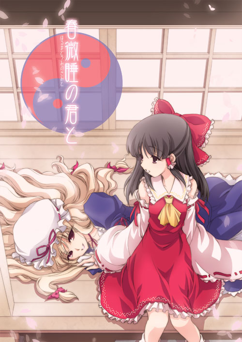 2girlsblack hairblonde hairfemale focushatholding handsjapanese clotheslong hairlyingmikomultiple girlson sideribbonsittingveranda
