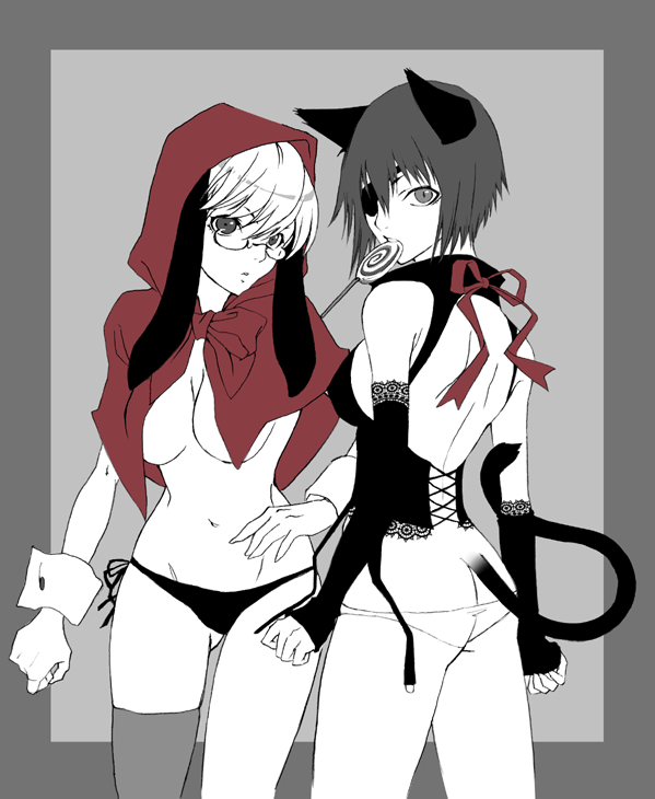 2girlsanimal earsasymmetrical clothesblack pantiesbreastscandycat earscat girlcat tailcleavagecuffsdetached sleeveseyepatchfemale focusfoodglasseshoodlarge breastslollipoplong hairlowleglowleg pantiesmidriffmouth holdmultiple girlsnavelpantiesrabbit earsribbonside-tie pantiessingle thighhighswirl lollipoptailthighhighsunderwearwhite pantieswolfwrist cuffs
