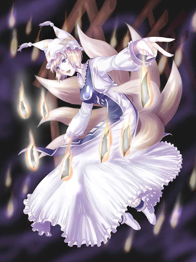 1girlanimal earsanimal hatblonde hairburningdressfemale focusfloatingfox earsfox tailfull bodyhatlong sleevesmob capmultiple tailsofudaopen mouthoutstretched armspurple eyesshoesshort hairsmilesolospread armstabardtailtassel