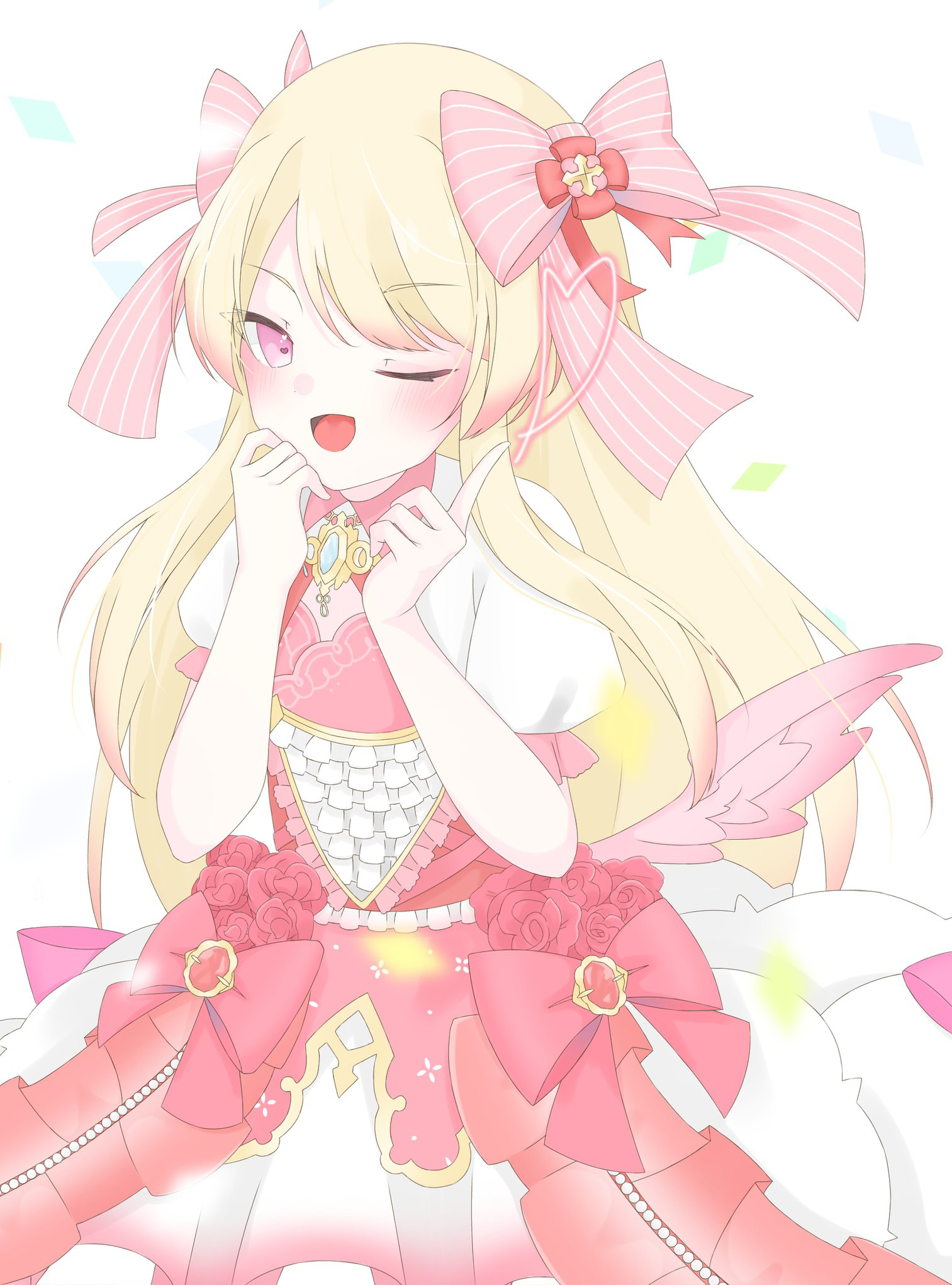 1girlblonde haircleavage cutoutclothing cutoutlong hairlong sidelocksone eye closedopen mouthsidelockssmilesolowhite background