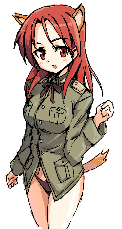 00s1girlanimal earsfemale focusformal clothesmilitarymilitary uniformno pantsoekakiopen mouthpantiesred eyesred hairribbonsimple backgroundsolotailunderwearwhite backgroundwolf earswolf tail