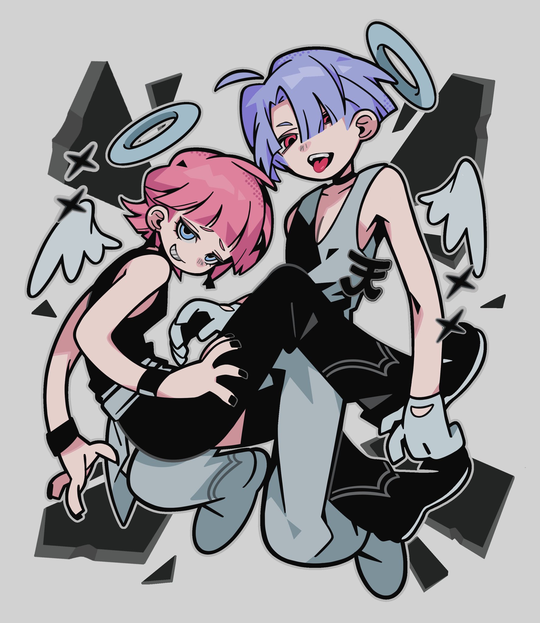 2boysahogeangelangel wingsaqua eyesbare shouldersbeltblack jumpsuitblack nailsblue hairblunt bangsbrothersclothing cutoutfull bodyglove cutoutglovesgrey backgroundgrinhalojitomejumpsuitlooking at viewermale focusmultiple boysnail polishparted bangspink hairred eyesshort hairsiblingssmileteethtonguetongue outupper teeth onlywhite gloveswhite jumpsuitwhite wingswingswristband