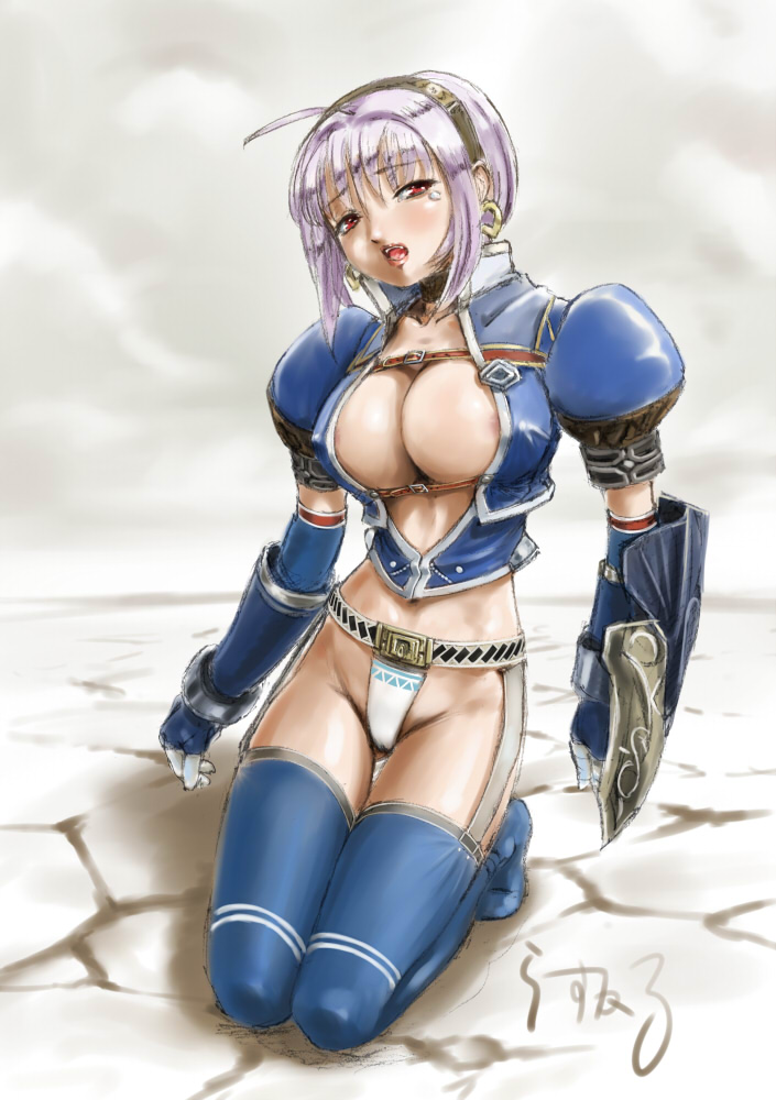 satou kuuki, kisaragi nozomi, shinsou seiki elementia, game cg, non-web source, official art, variant set, 1girl, adapted costume, armband, black hair, black thighhighs, blunt bangs, blush, bow, bowtie, breasts, bridal gauntlets, cleavage, cleavage cutout, closed mouth, clothing cutout, covered erect nipples, elbow gloves, fishnet thighhighs, fishnets, g-string, gloves, gluteal fold, hair bow, hand on own hip, heart, highleg, highleg panties, large breasts, long hair, looking at viewer, micro panties, microskirt, navel, panties, pleated skirt, ponytail, purple eyes, shiny skin, skirt, solo, standing, string panties, thighhighs, thong, transparent background, underwear