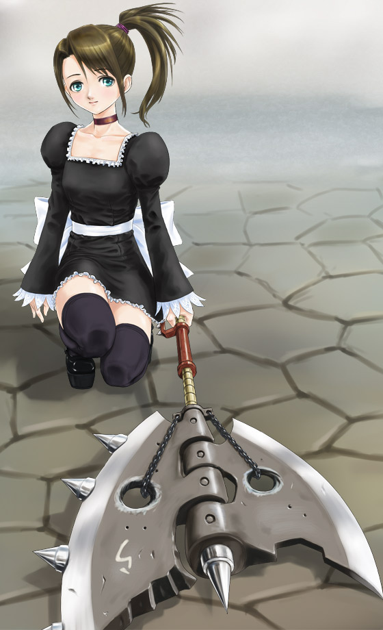 axeblue eyesblushbrown hairchokercombat maidhuge weaponkneelinglong hairmaidon one kneeponytailside ponytailsolothighhighswarriorweapon