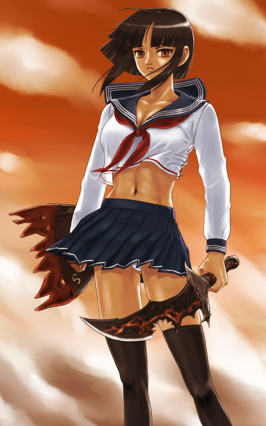 black hairmidriffpantiespantyshotred eyesschool uniformserafukushieldshort hairskirtsolosunsetswordthighhighsunderwearweaponwhite pantieswindwind lift