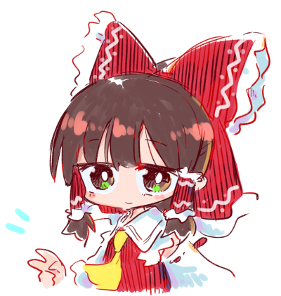 1girlblush stickersbowbrown eyesbrown hairchibiclosed mouthcollared shirtcropped torsohair bowhair tubeshand uplong hairnotice linesred bowred shirtromaji commentaryshirtsimple backgroundsleevelesssleeveless shirtsmilesoloupper bodyvwhite background