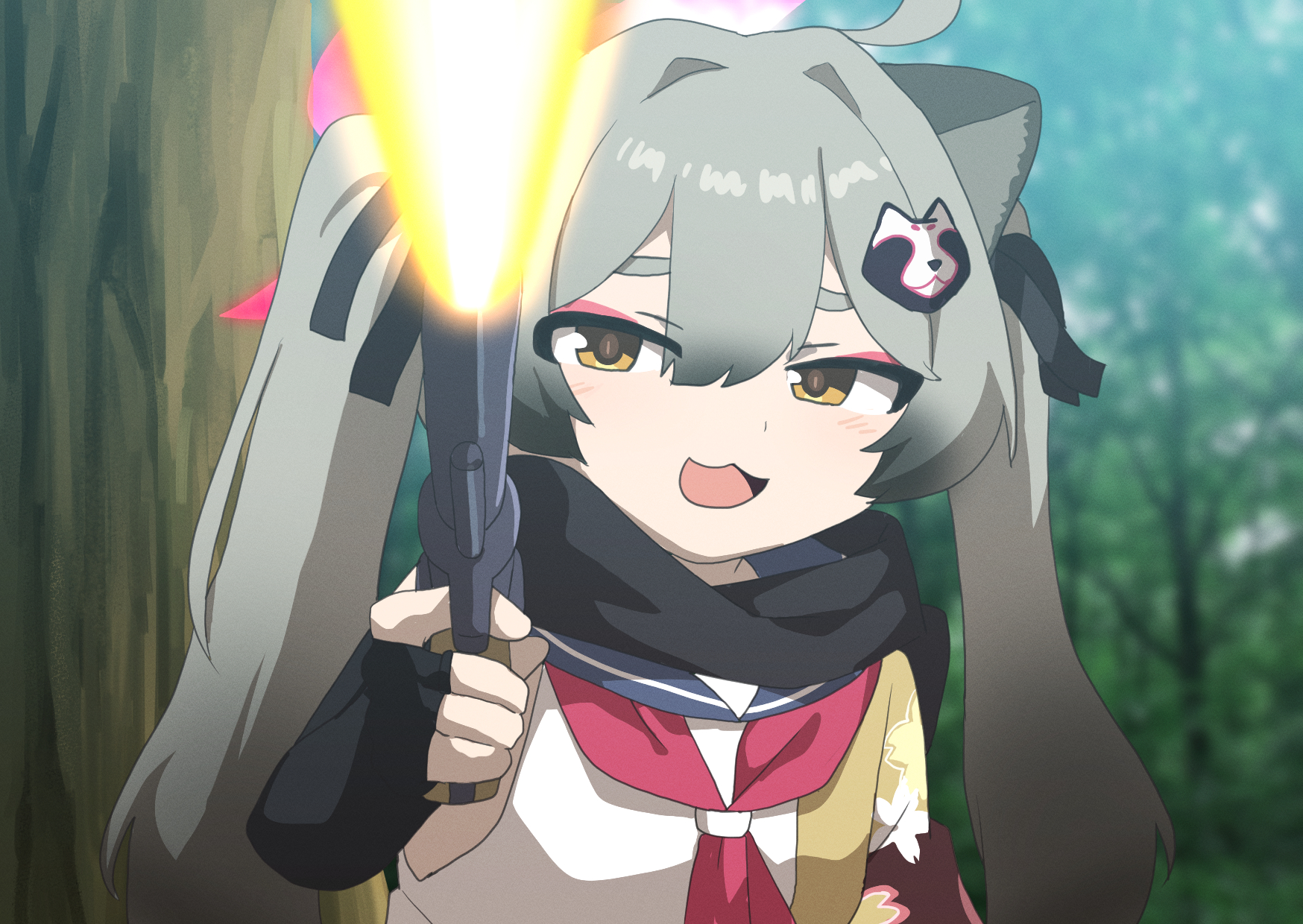 1girlanimal earsblack glovesblack scarfblurryblurry backgroundelbow gloveseyeshadowfingerless glovesfiringforestglovesgrey hairgunholdingholding gunholding weaponlong hairlooking at viewermakeupmuzzle flashnatureneckerchiefopen mouthoutdoorsparodypink eyeshadowraccoon earsraccoon girlred neckerchiefscarfshirtsmilesolotwintailsweaponwhite shirtyellow eyes