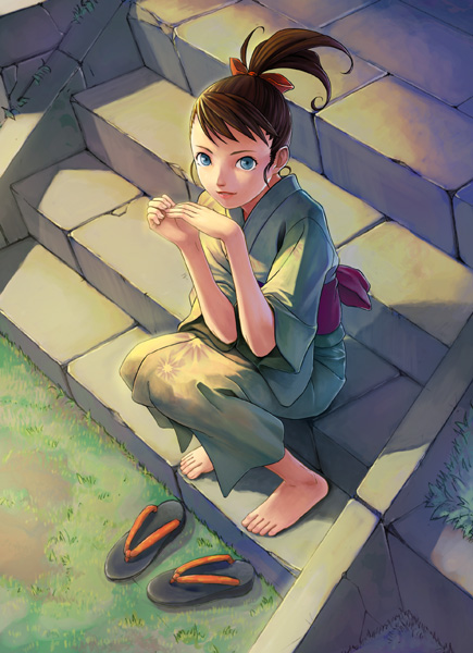 1girlbarefootblue eyesbrown hairfeetfemale focusjapanese clotheskimonoponytailsittingsitting on stairssolostairstoes