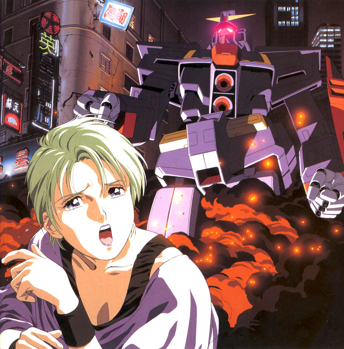 cityfireglowinggreen hairhong konglipstickmakeupmechaoldschoolpurple lipsretro artstylerobotshort hairtears